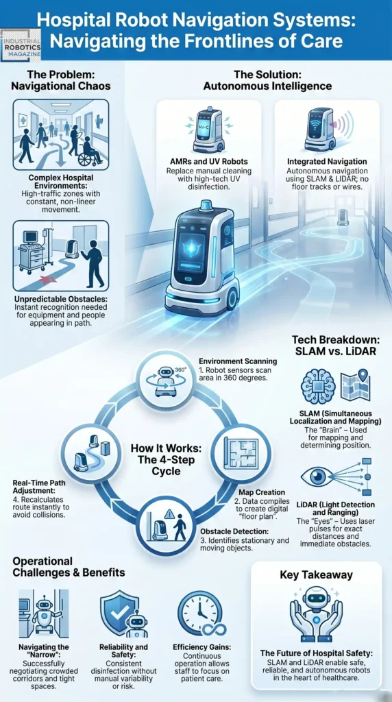 Hospital robot navigation systems are essential for enabling autonomous robots to move safely through complex healthcare environments. These systems use SLAM and LiDAR technologies to map surroundings, detect obstacles, and operate efficiently in hospitals.